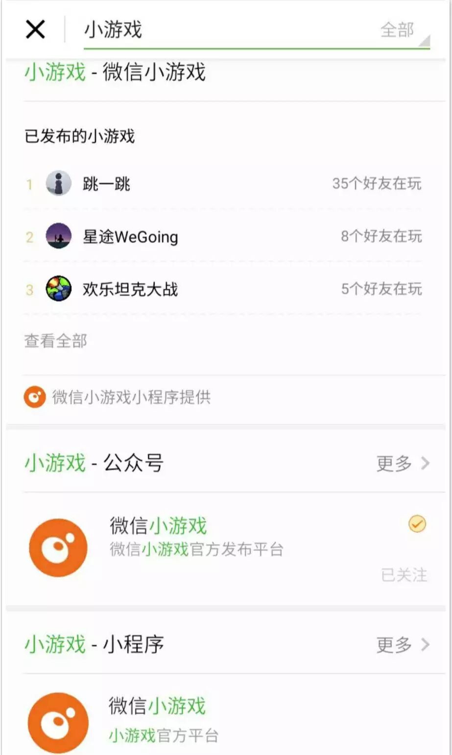 入口二:点击微信搜索,输入“小游戏”,会出现和小游戏相关的信息。